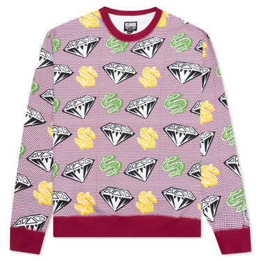 The Billionaire Boys Club BB Diamond Dollar Crew features a french terry fabric that provides optimal warmth and comfort, perfect for the cooler months. A crew neckline is placed along with ribbed cuffs and hem for additional detail. The design features an all-over print that features an applied Billionaire Boys Club motifs including money signs and diamonds.