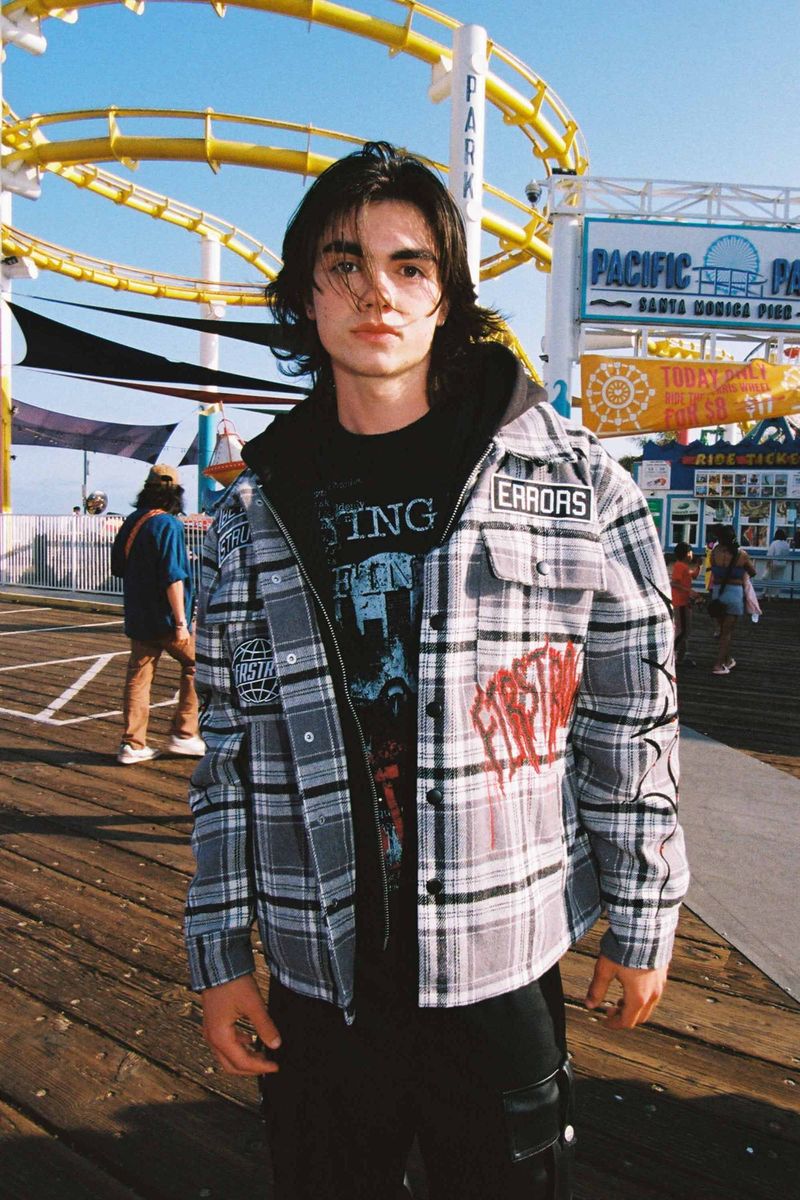 A relaxed fit shirt jacket with wool-blended fabric body. Featuring unique multi patches with chain stitches with a snap button center front closure.