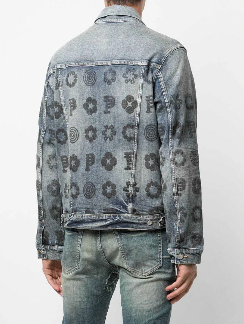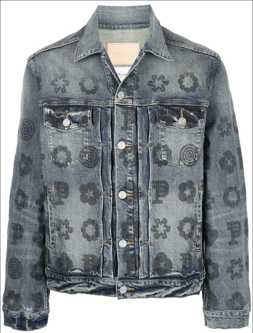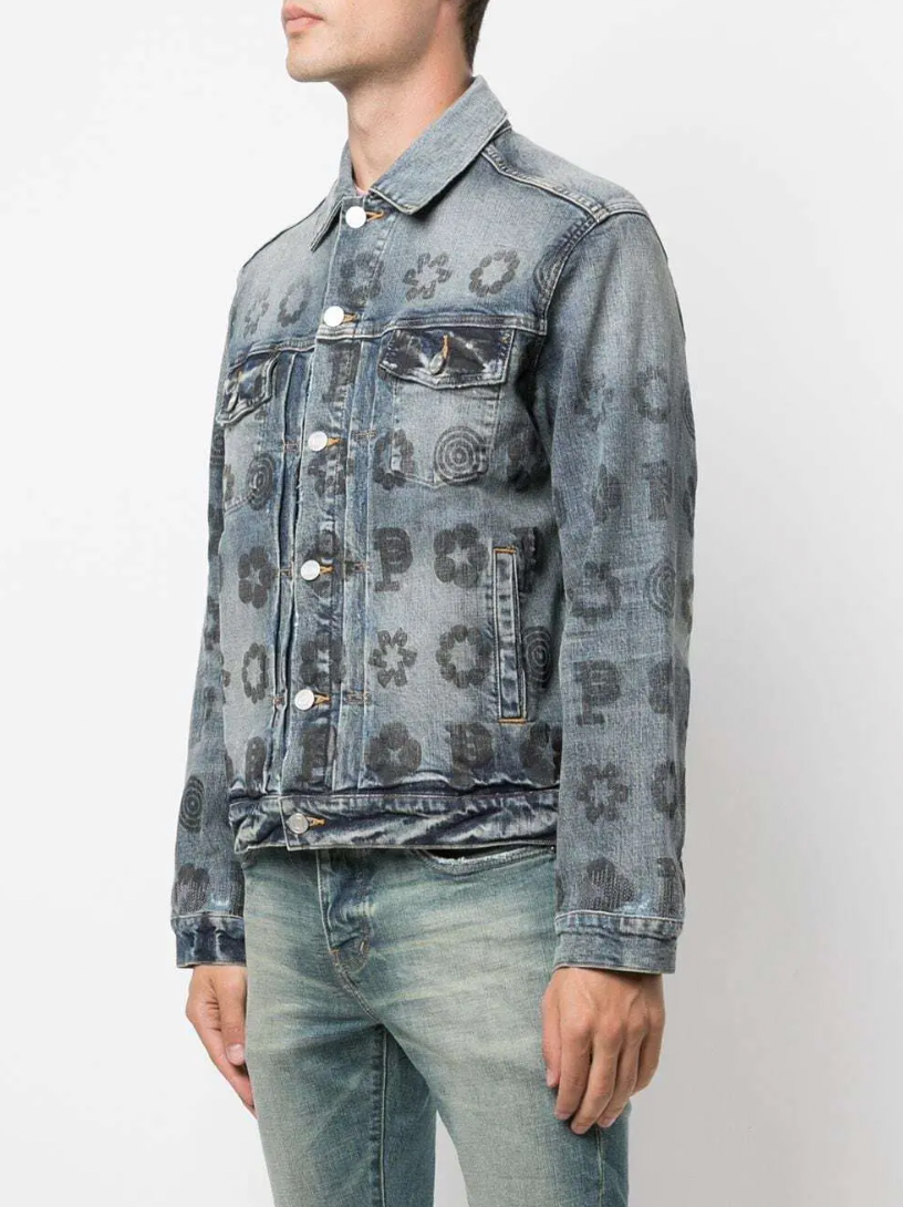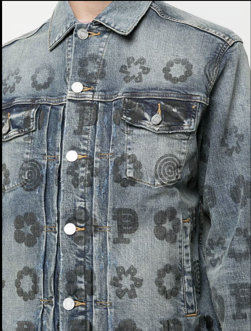monogram-leopard print denim jacket from Purple Brand featuring black, cotton, monogram pattern, classic collar, front button fastening, long sleeves, two chest patch pockets and straight hem.