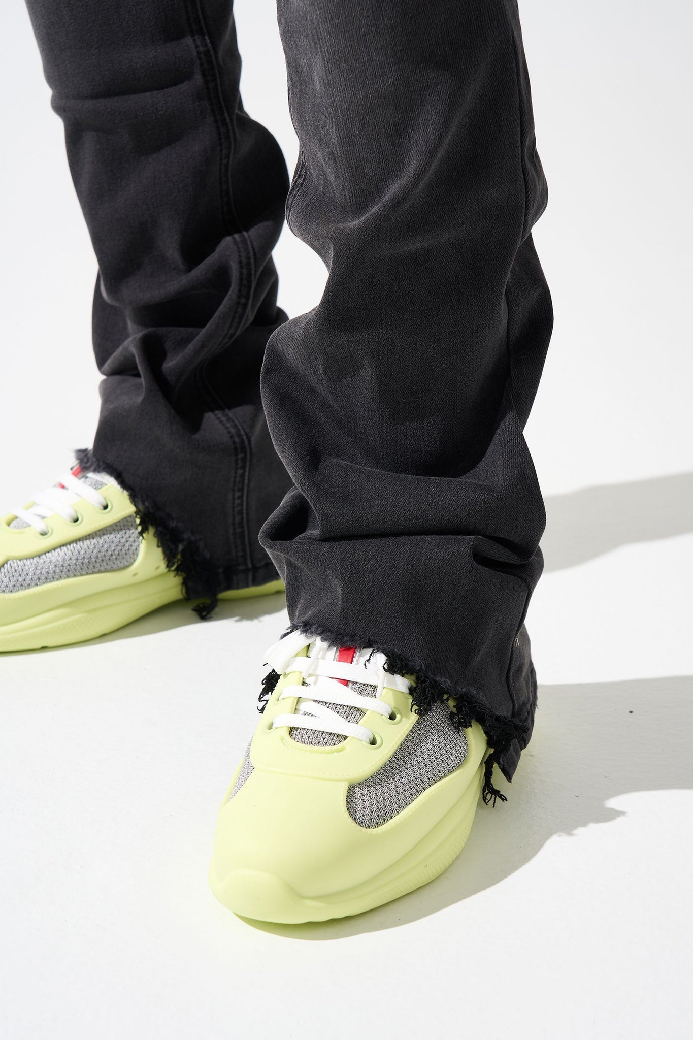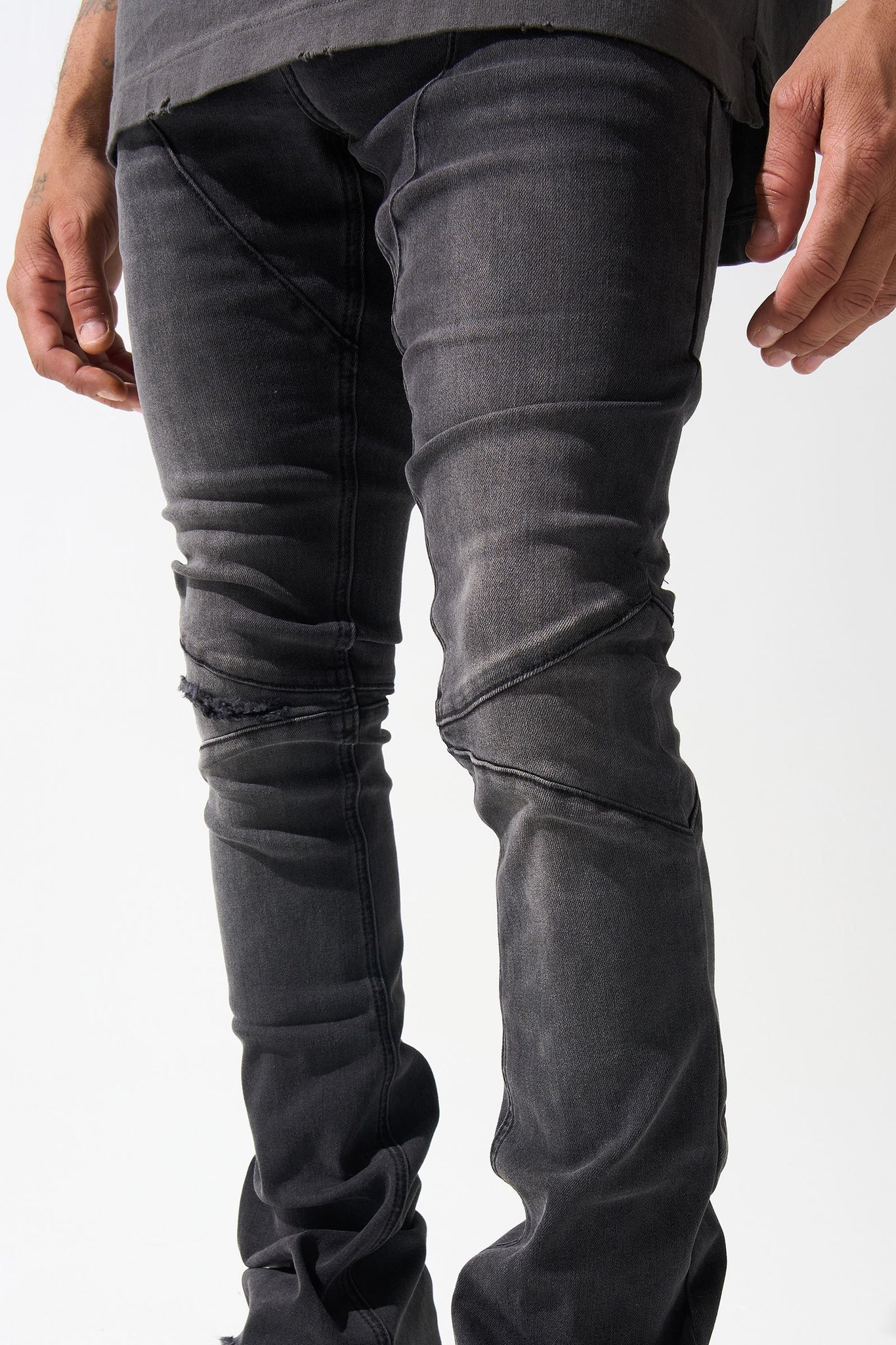 SERENEDE® "NICKEL" stacked jeans feature a vintage dark grey wash with moto knee panels. Fading and distressing throughout. 8.5" leg opening. 36" inseam length (stack). Five-pocket styling. Leather logo patch at back waistband. Zip-fly. SERENEDE® branded buttons and rivet hardware accents. Embroidered [S] authenticity logo behind the leg.