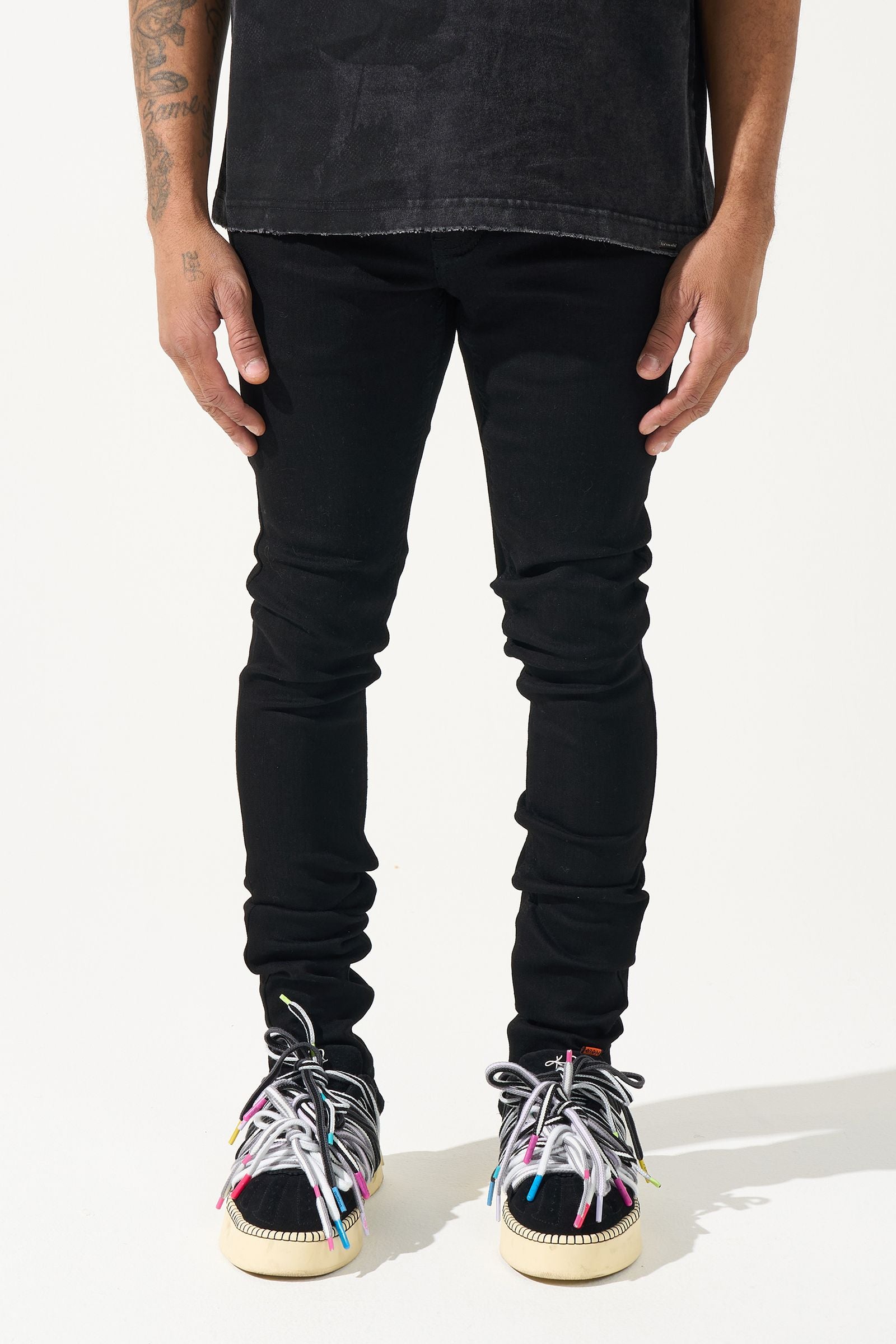 Deep black skinny denim construction