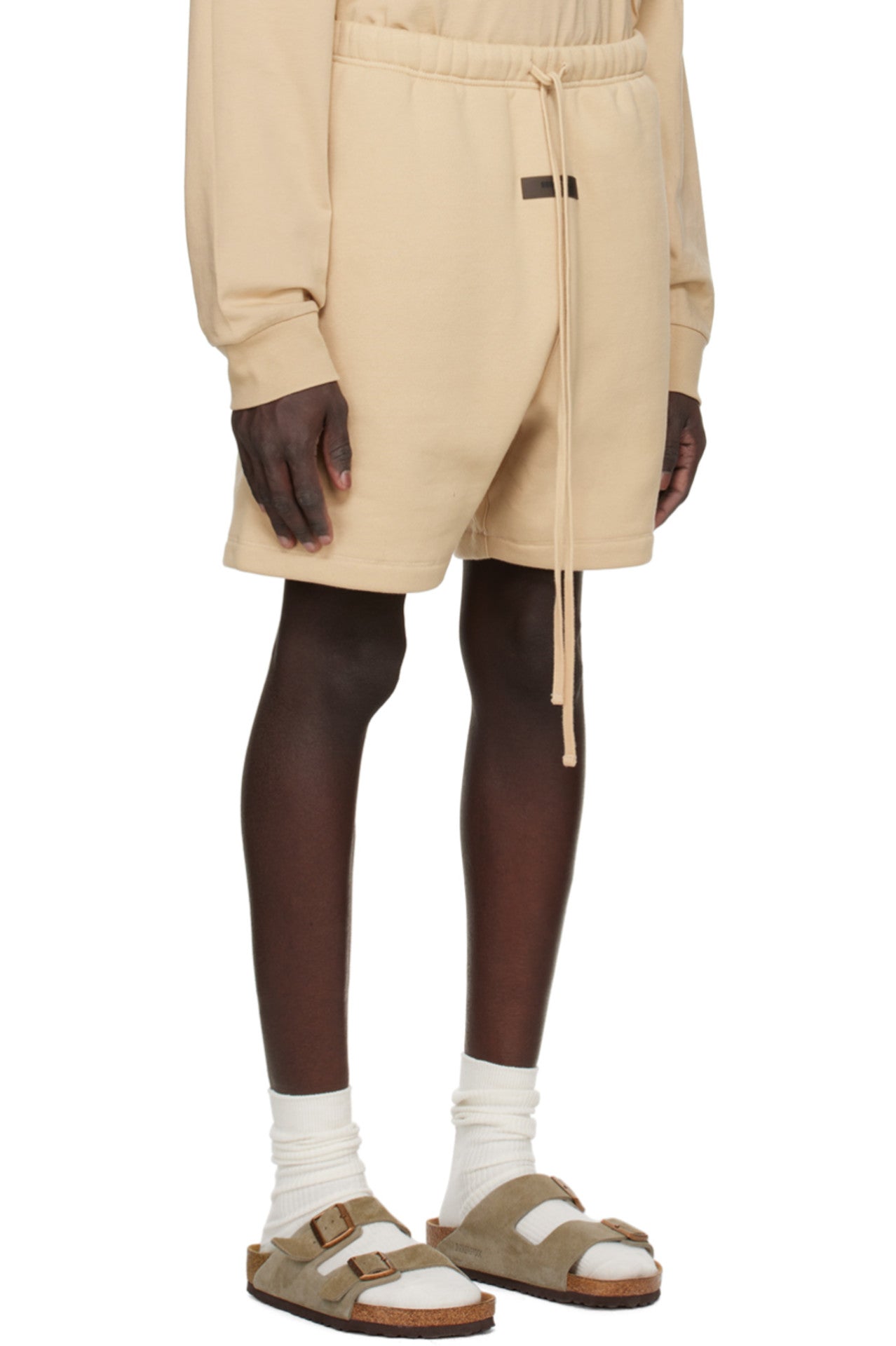 The signature Essentials shorts is updated with a flocked logo treatment inspired by vintage athletic sweats. A shiny Essentials Fear of God logo is on the left leg, and an Essentials rubberized label is stitched on the center front.