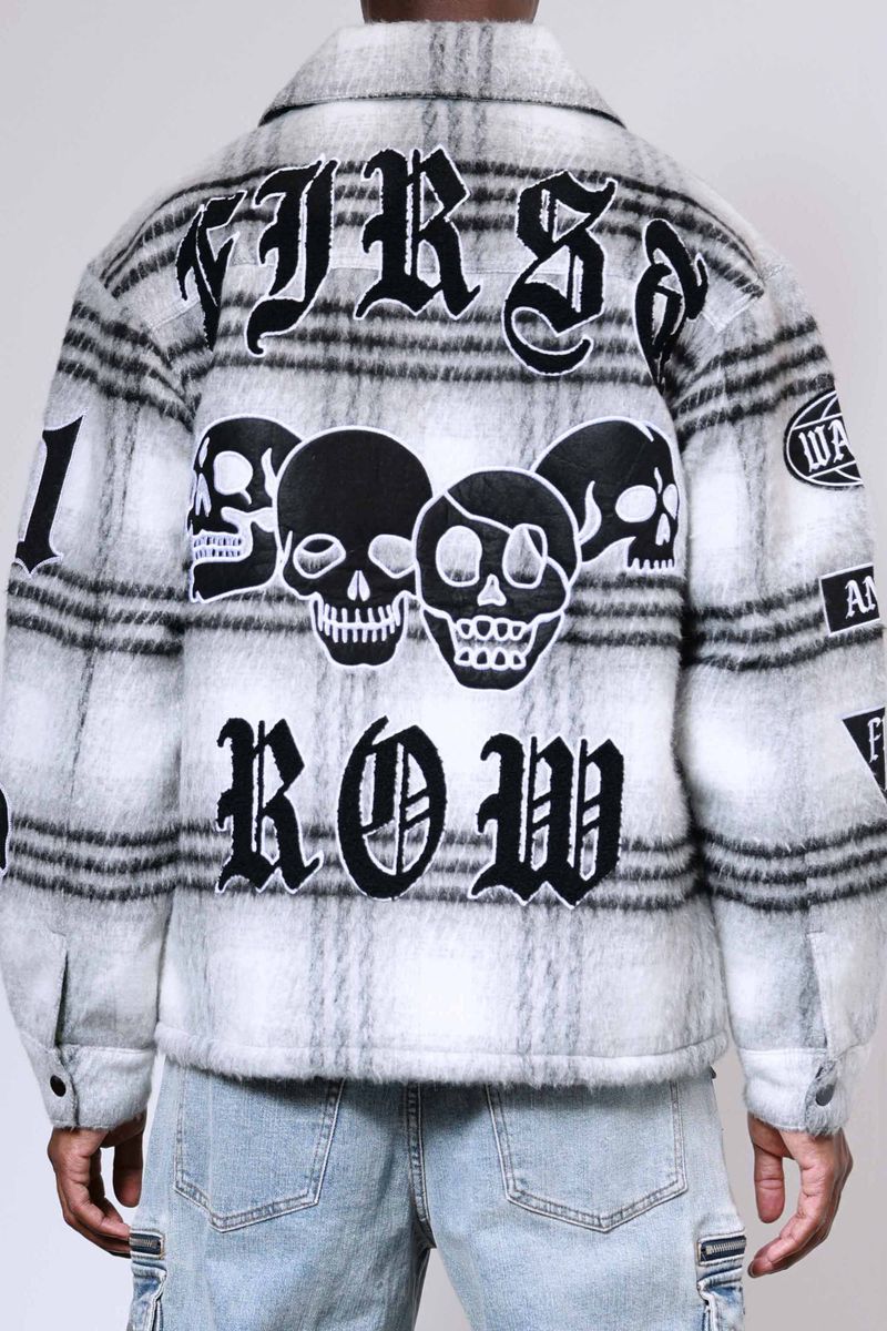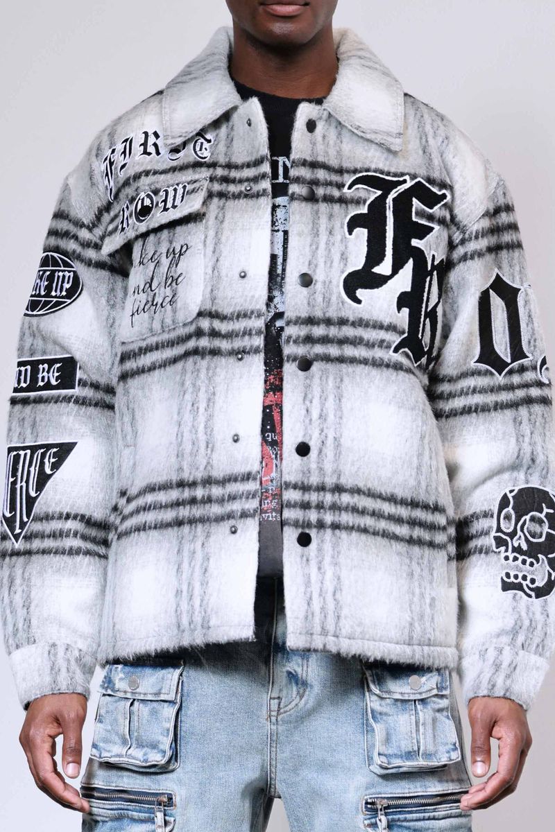 A relaxed fit shirt jacket with wool-blended fabric body. Featuring unique multi patches with chain stitches with a snap button center front closure.