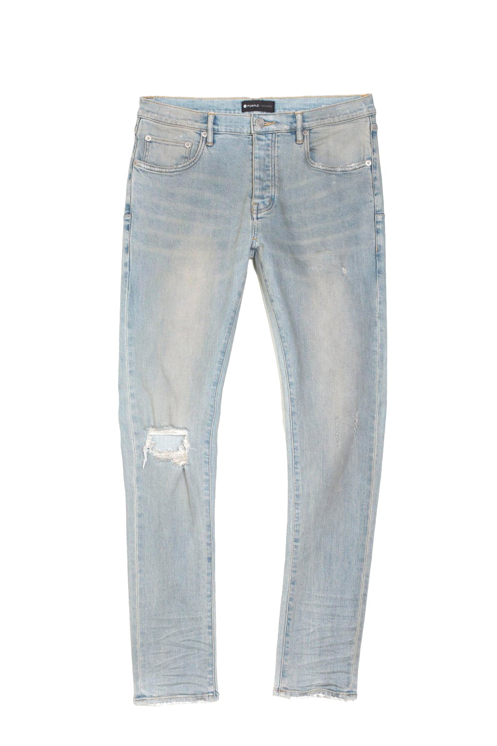 A Purple staple, the P001 low rise skinny is crafted from premium stretch denim and fitted through the thigh to the ankle for a classic taper. This core denim features bar-tack stitching, hidden rivets, a chambray lining and darts at the side seams and back pocket for a more comfortable and enhanced fit. This style is detailed with classic five pocket styling, a button fly closure, features a custom Purple cowhide leather patch and signature hang tag branding.Constructed in a light wash, this elevated denim is designed with blowout detailing at the knees, 3D wrinkle treatment, light abrasion at the pockets and hem and finished with hand-applied paint splatter for a distressed vintage look.