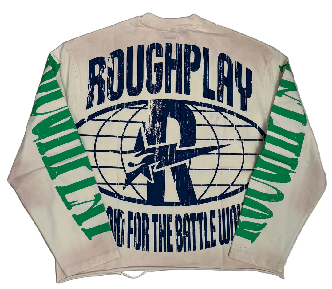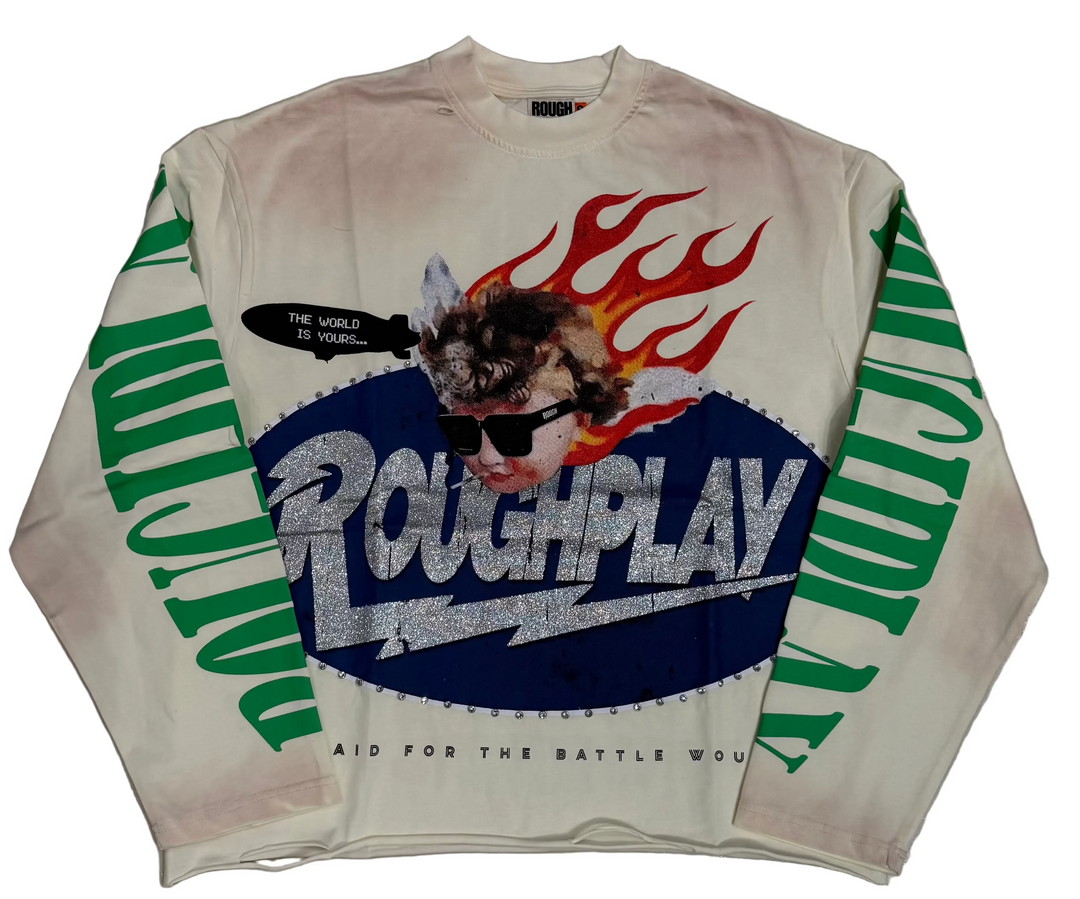 Get ready to rock out in style with the RoughPlay🩹Tan LS T-Shirt! This grey tee features a fiery skeleton jamming on a guitar, perfect for those rough days.