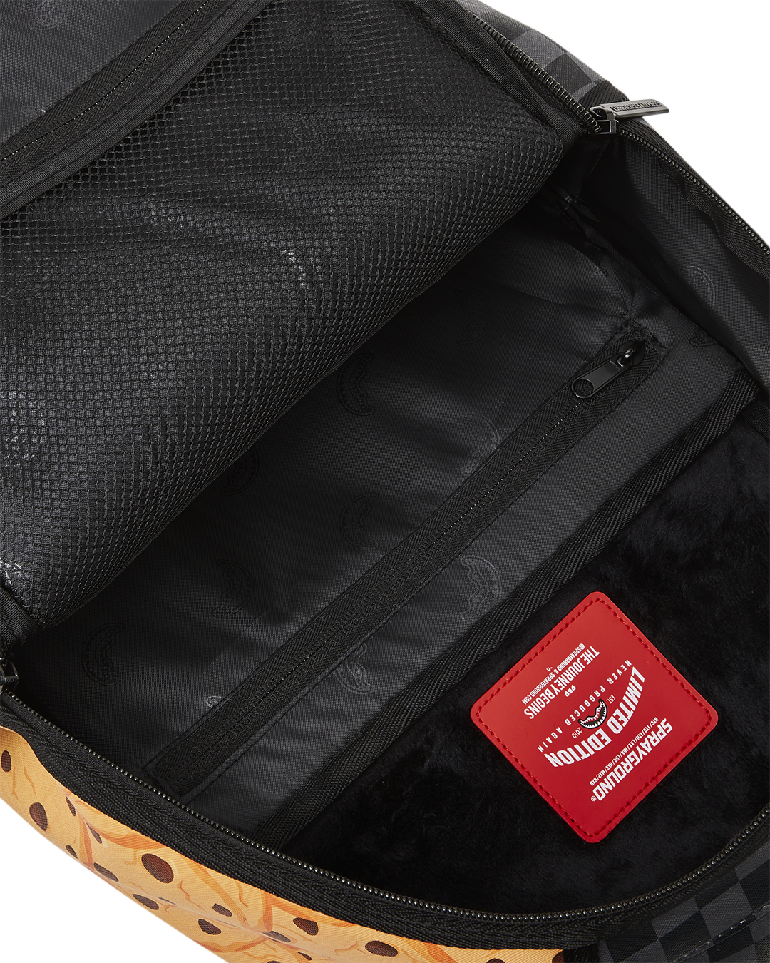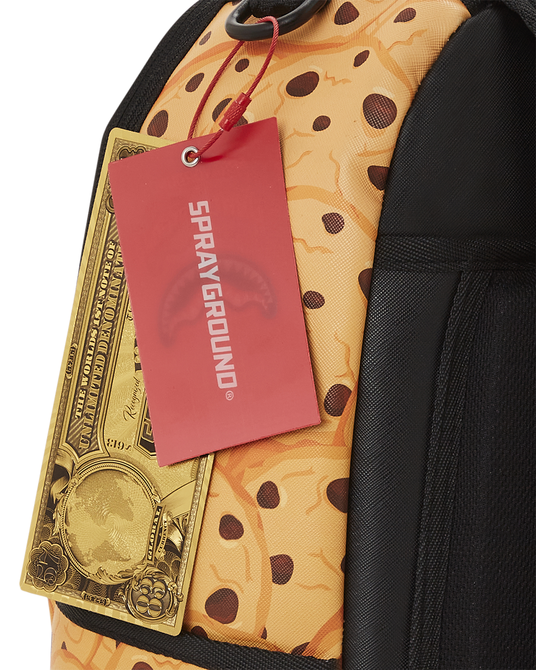 Dimensions: 18" x 6" x 11.5" • Front zipper pocket • Side pockets • Zippered Stash pocket • Separate velour sunglass compartment • Ergonomic mesh back padding • Adjustable Straps for custom sizing • Gold zippers with metal hardware • Metal "Sprayground Authentic" badge • Slide through back sleeve connects to carry-on luggage to free your hands