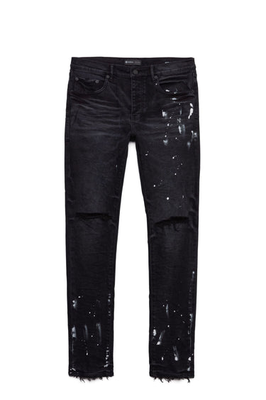 Constructed in a vintage black wash, this elevated denim is designed with blowout detailing at the knee, hand-applied paint splatter, and a 3D wrinkle treatment for a distressed and vintage feel.