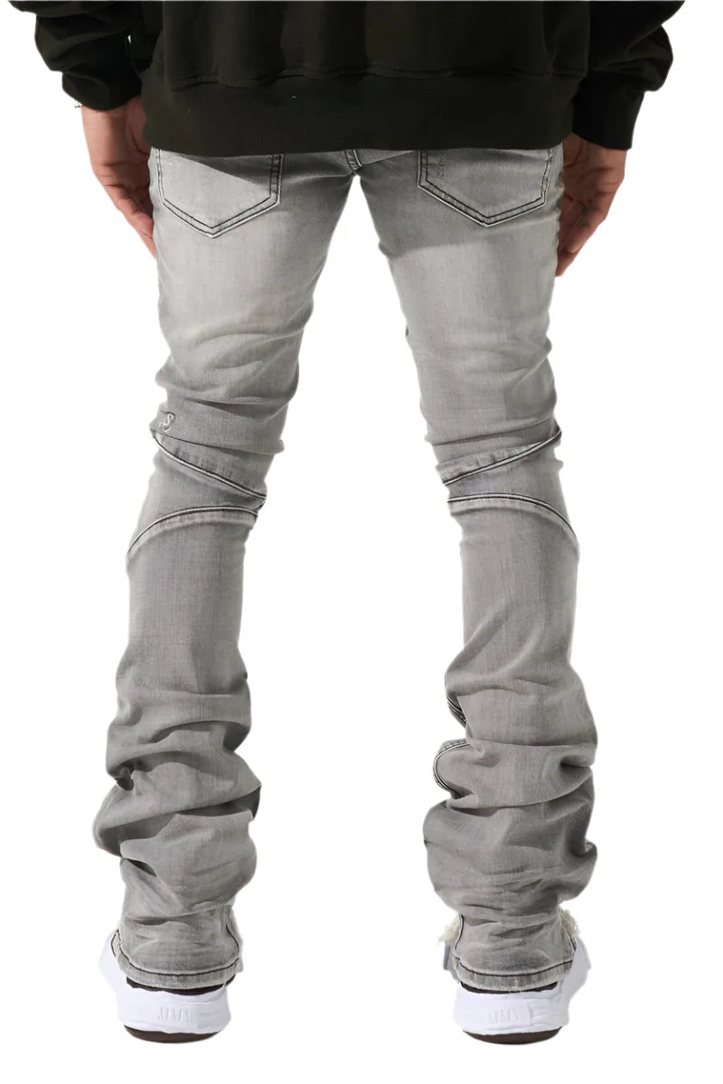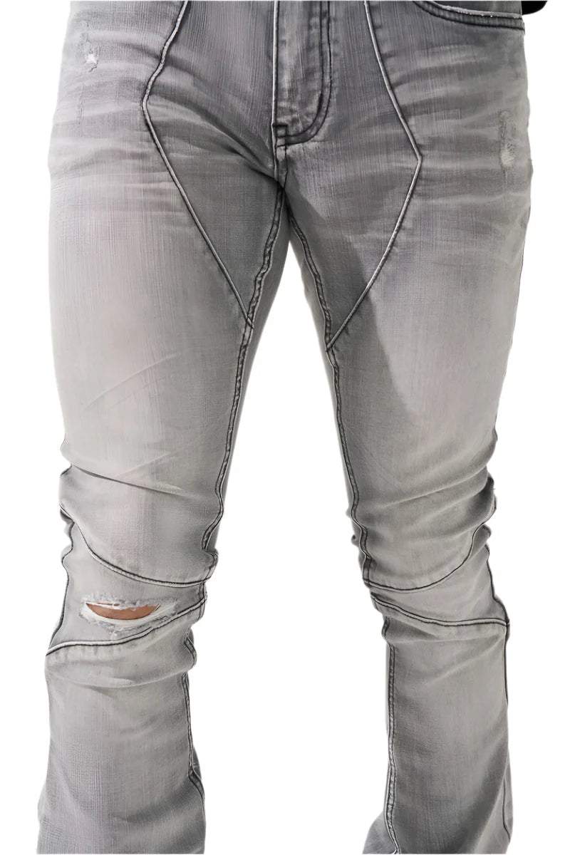 SERENEDE® "Noctis" stacked jeans feature a washed grey denim fabric with moto knee panels. Fading and distressing throughout. 8.5" leg opening. 36" inseam length (stack). Five-pocket styling. Leather logo patch at back waistband. Zip-fly. SERENEDE® branded buttons and rivet hardware accents. Embroidered [S] authenticity logo behind the leg.