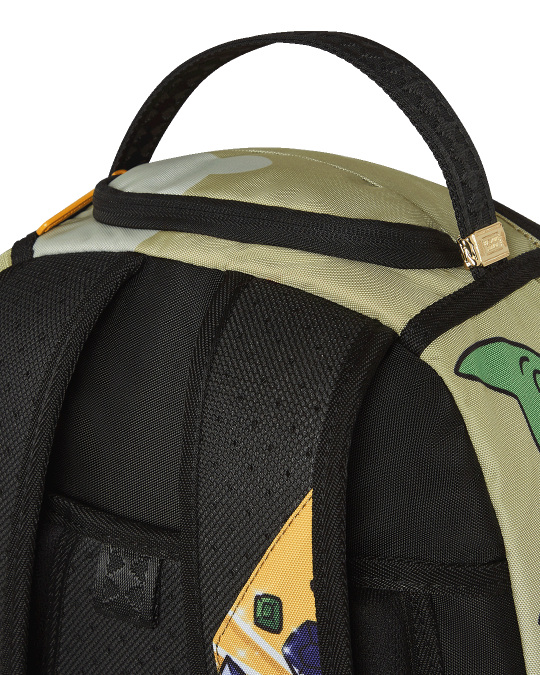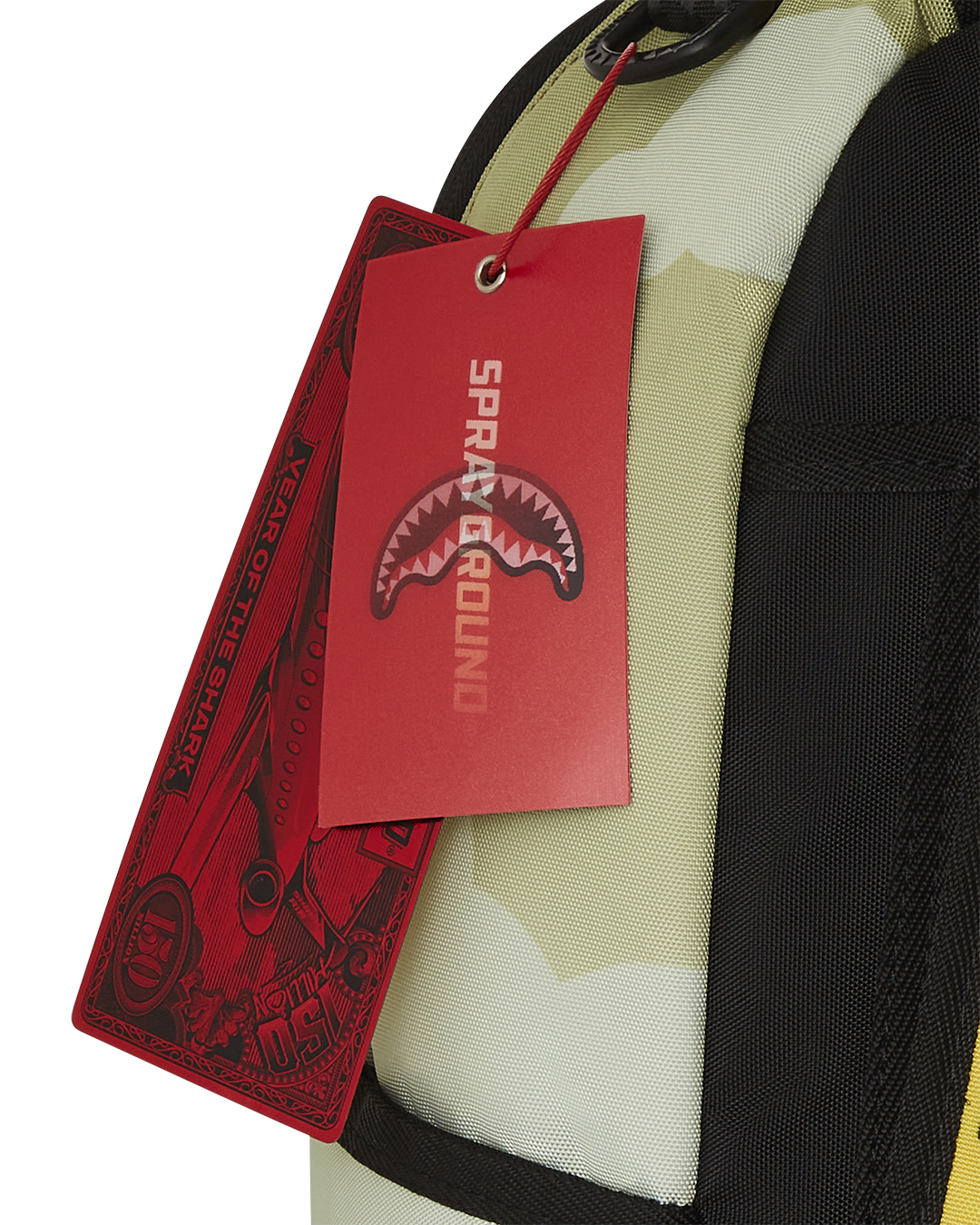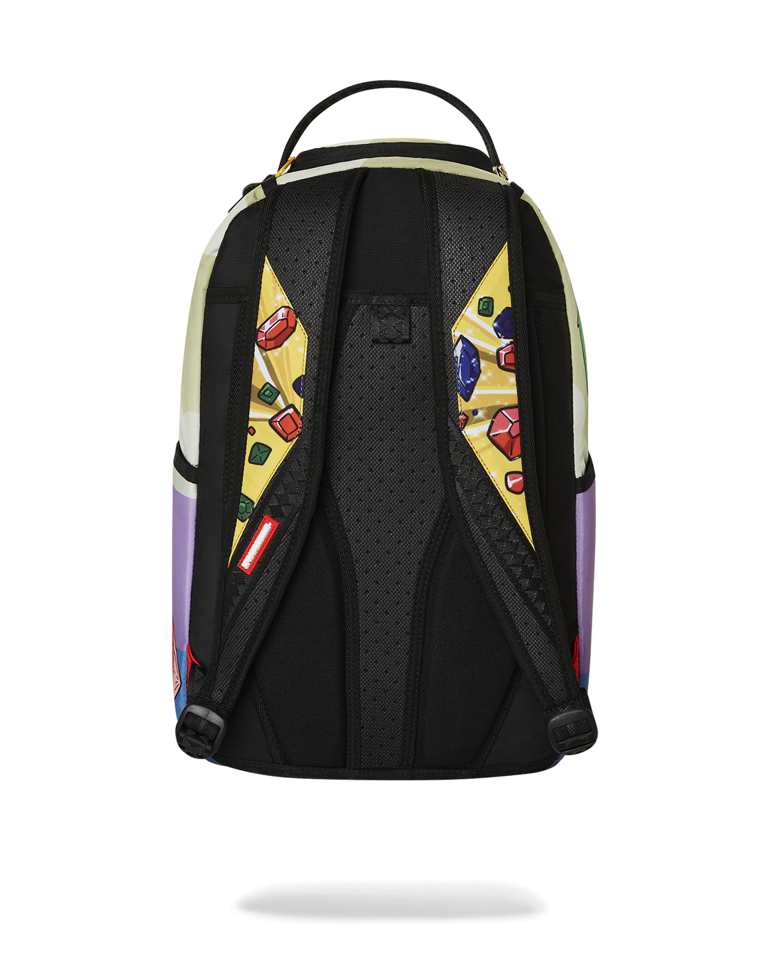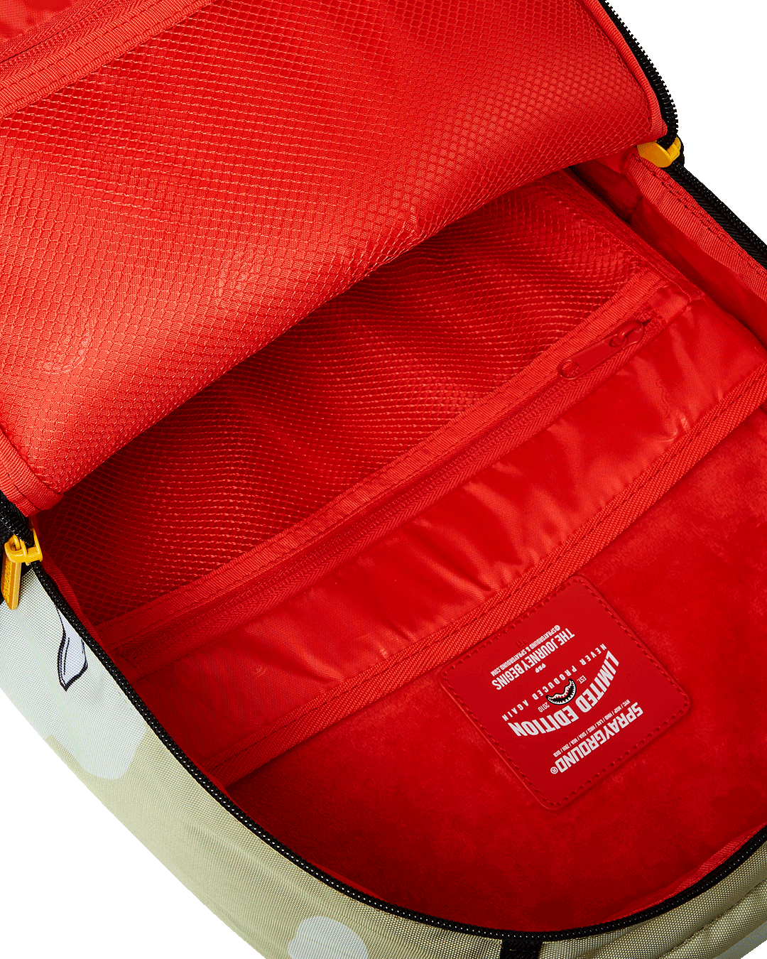 Dimensions: 18" x 6" x 11.5" • Front zipper pocket • Side pockets • Zippered Stash pocket • Separate velour sunglass compartment • Ergonomic mesh back padding • Adjustable Straps for custom sizing • Gold zippers with metal hardware • Metal "Sprayground Authentic" badge • Slide through back sleeve connects to carry-on luggage to free your hands