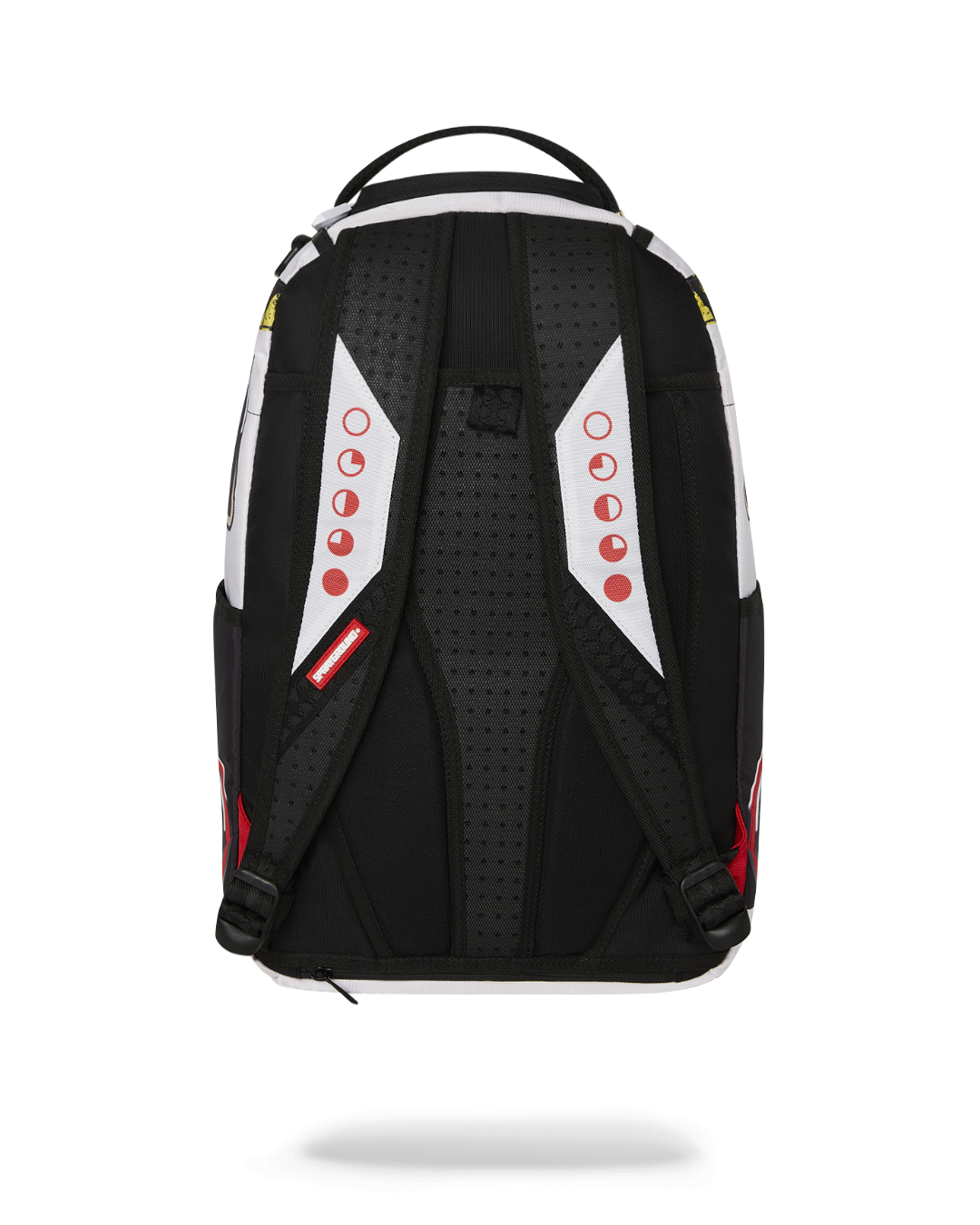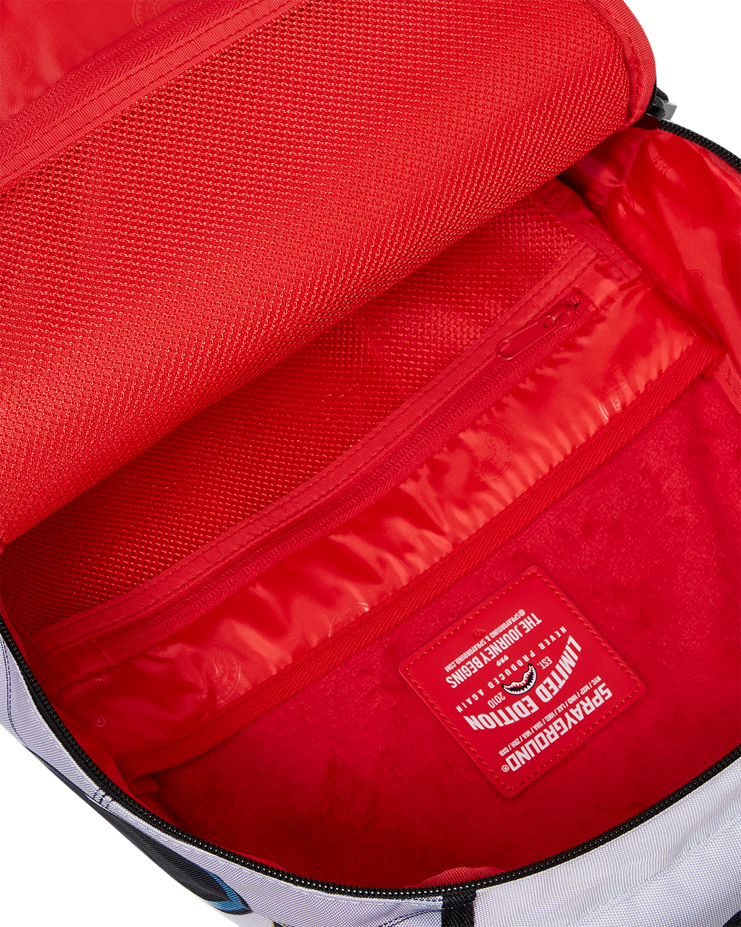 Dimensions: 18" x 6" x 11.5" • Front zipper pocket • Side pockets • Zippered Stash pocket • Separate velour sunglass compartment • Ergonomic mesh back padding • Adjustable Straps for custom sizing • Gold zippers with metal hardware • Metal "Sprayground Authentic" badge • Slide through back sleeve connects to carry-on luggage to free your hands