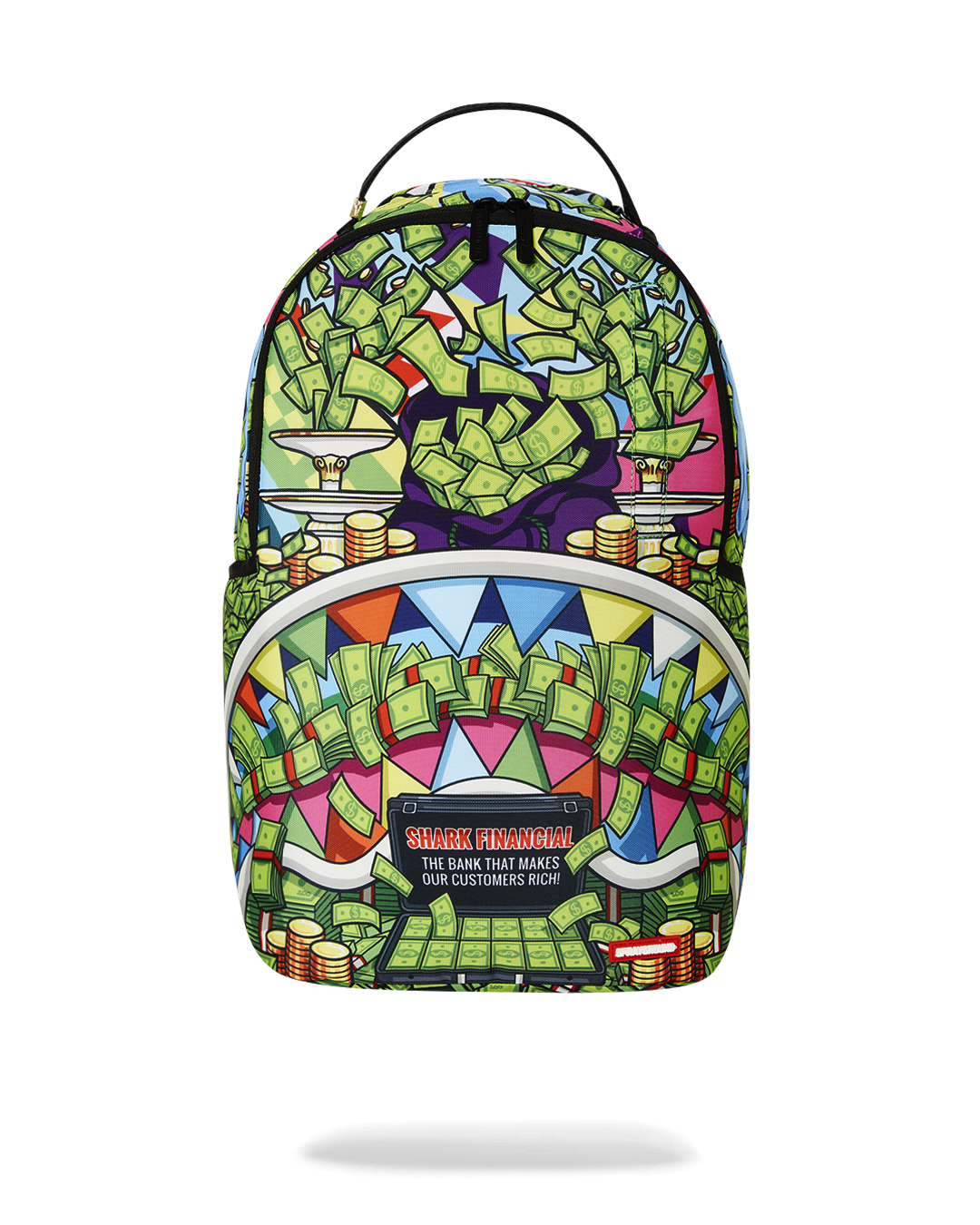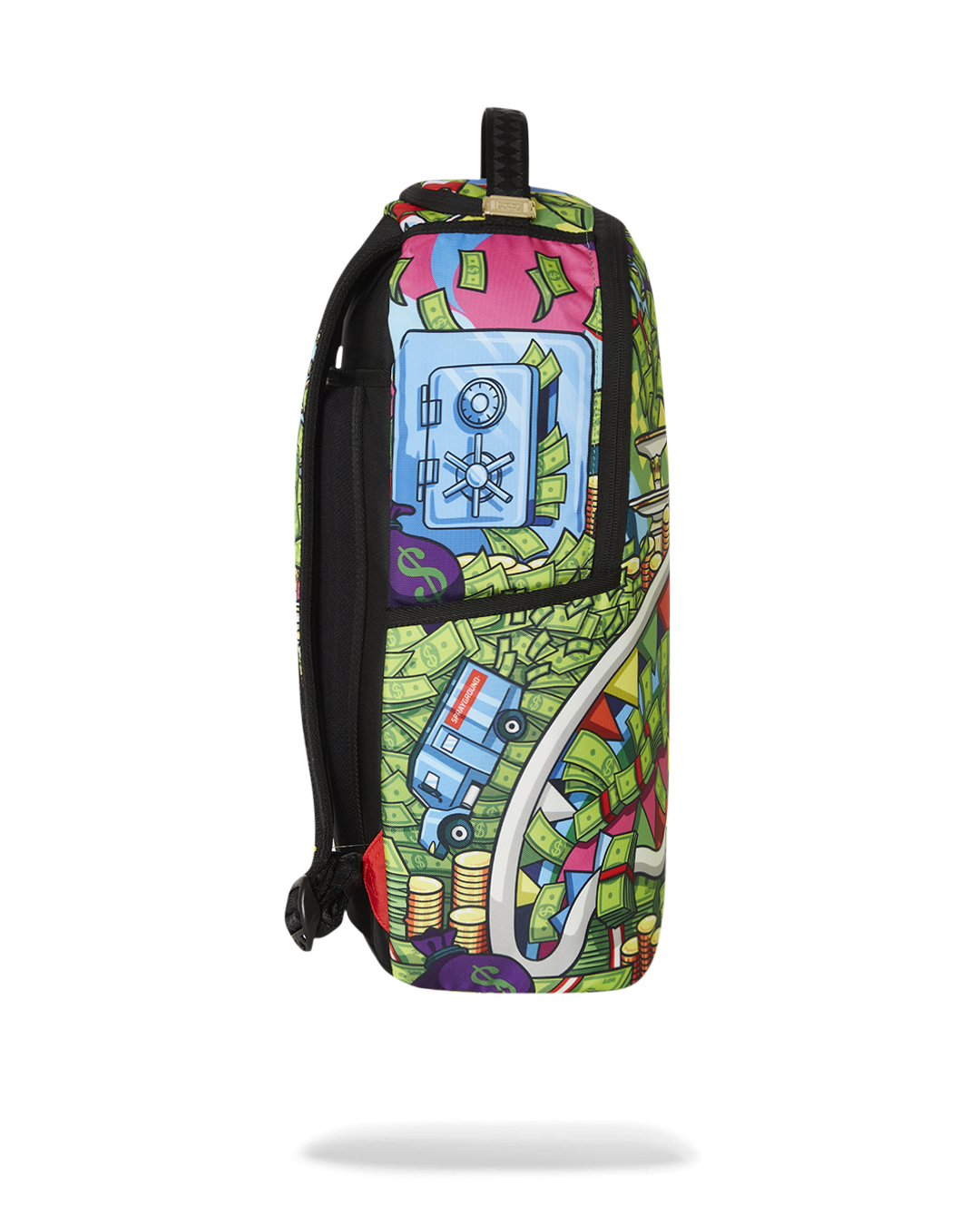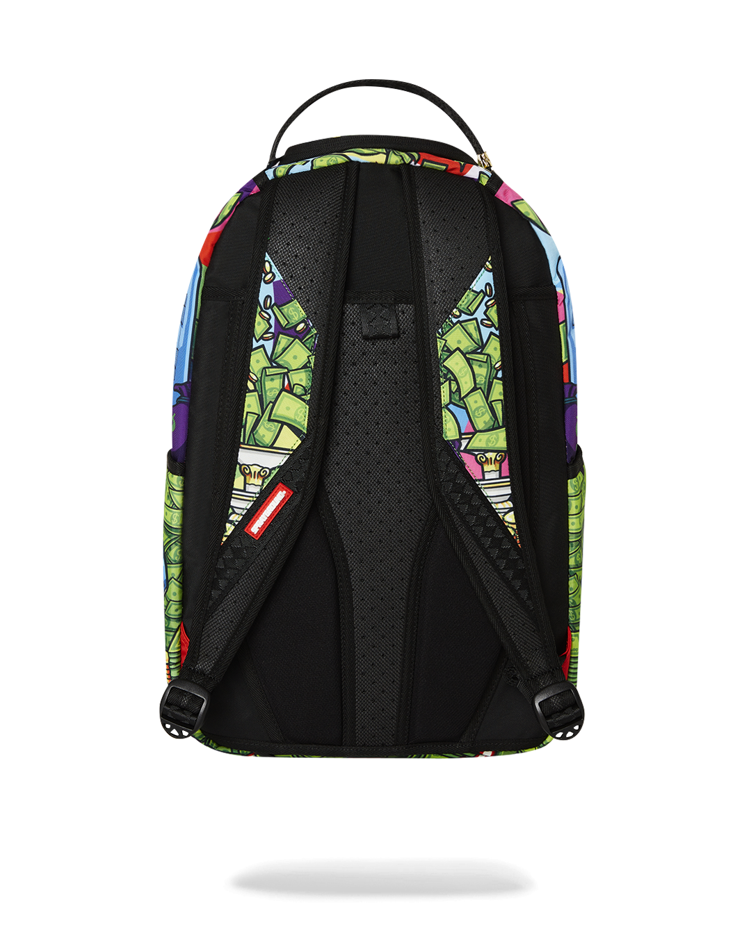 Dimensions: 18" x 6" x 11.5" • Front zipper pocket • Side pockets • Zippered Stash pocket • Separate velour sunglass compartment • Ergonomic mesh back padding • Adjustable Straps for custom sizing • Gold zippers with metal hardware • Metal "Sprayground Authentic" badge • Slide through back sleeve connects to carry-on luggage to free your hands