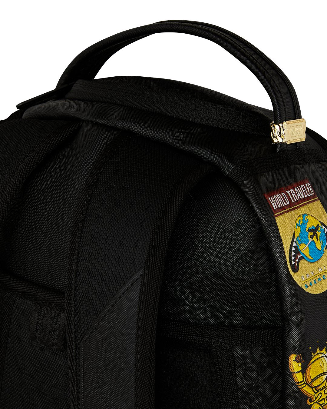 Dimensions: 18" x 6" x 11.5" • Front zipper pocket • Side pockets • Zippered Stash pocket • Separate velour sunglass compartment • Ergonomic mesh back padding • Adjustable Straps for custom sizing • Gold zippers with metal hardware • Metal "Sprayground Authentic" badge • Slide through back sleeve connects to carry-on luggage to free your hands