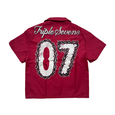 - Product Name:Triple Sevens Red Nylon Button Up Shirt