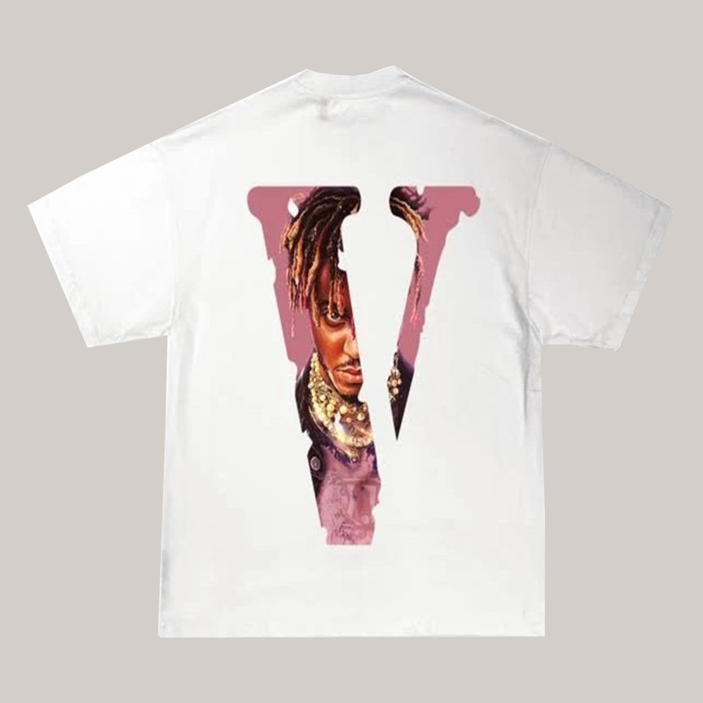 This Vlone tee features a bold Juice Wrld graphic on a classic white construction. Crafted from high-quality cotton and detailed with a ribbed crewneck, this tee is perfect for any fan of this late artist. Enjoy the comfort of the soft, lightweight fabric and the tribute on your chest.